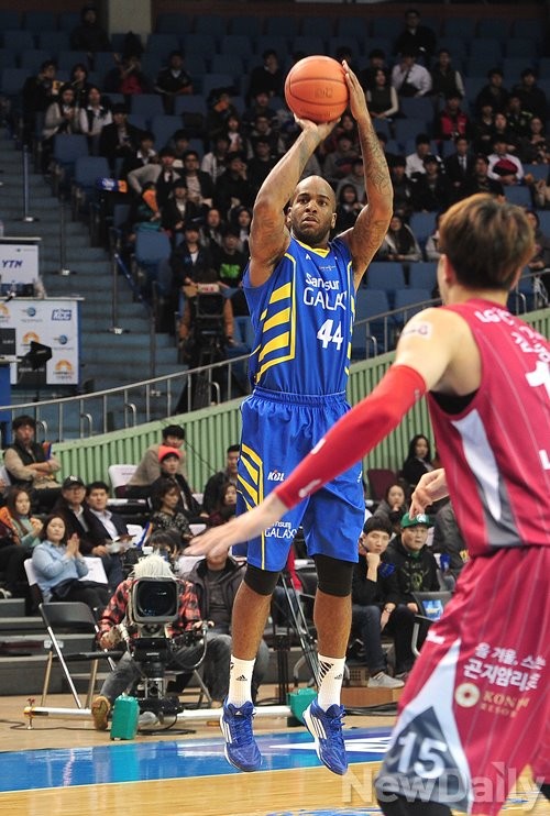 31일 서울 잠실실내체육관에서 열린 2014-2015 KCC 프로농구 서울 삼성과 창원 LG의 경기에서 서울 44번 라이온스가 3점슛을 성공 시키고 있다.