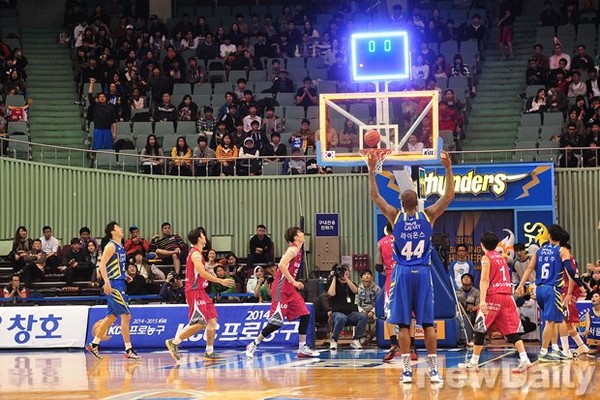 지난 31일 서울 잠실실내체육관에서 열린 2014-2015 KCC 프로농구 서울 삼성과 창원 LG의 경기에서 3쿼터 마지막 서울 삼성이 던진 버저비터가 아쉽게 골대를 맞고 무위에 그치고 있다.