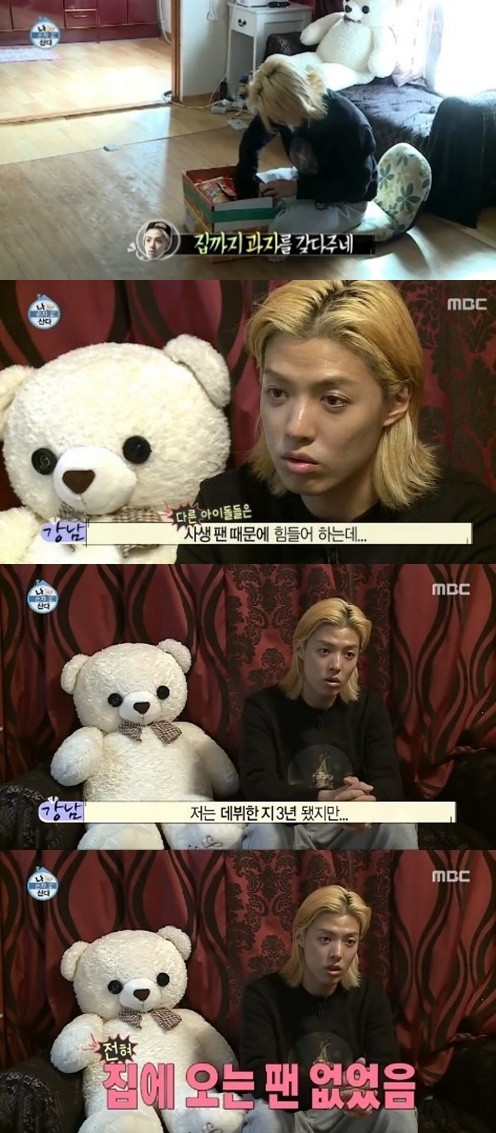 '나혼자산다' 강남이 팬들에게 감사한 마음을 전했다.10월 31일 방송된 MBC '나 혼자 산다'에서는 무지개 회원 정식 멤버로 합류한 그룹 M.I.B 강남의 일상이 전파를 탔다.이날 강남은 "오랜만에 쉰다"며 일어나자마자 과자가 담긴 상자에서 과자를 꺼내 먹었다. 그는 제작진과의 인터뷰를 통해 "집에 팬 분들이 오셔서 과자와 라면 등 먹거리를 챙겨주셨다"고 밝혔다.강남은 이어 "다른 아이돌들은 사생팬 때문에 힘들어하지만 난 데뷔한지 3년이 됐어도 집에 오는 팬들이 없었다. 지금은 집까지 오셔서 정말 행복하고 감사하다"고 고마움을 드러냈다.[나혼자산다 강남, 사진=MBC '나 혼자 산다' 방송 캡처]