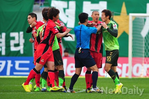 흥분한 전북 김남일 선수를 서울 차두리 선수가 말리고 있다.