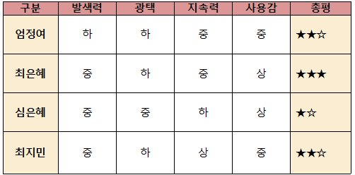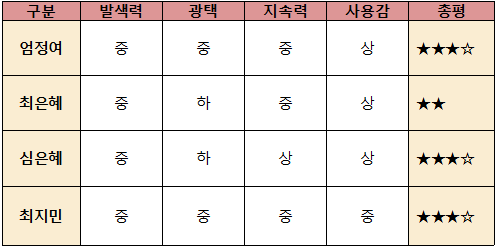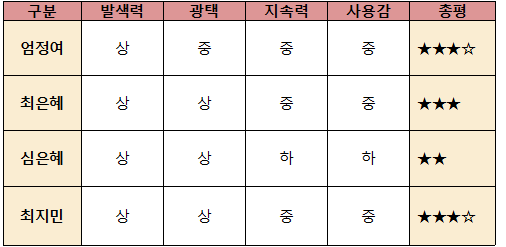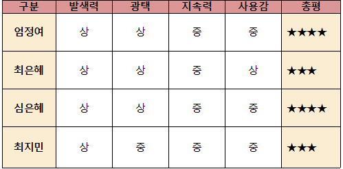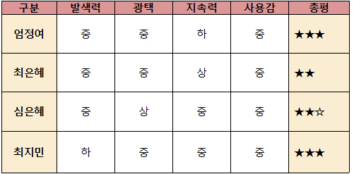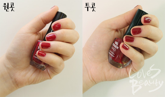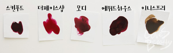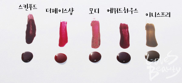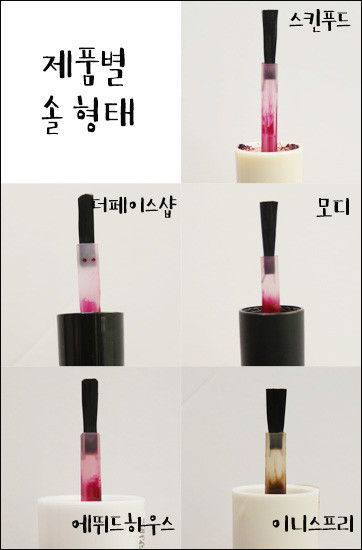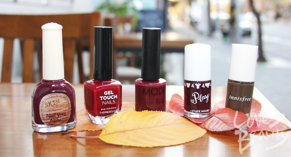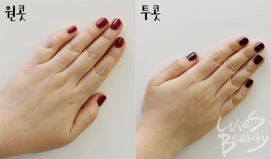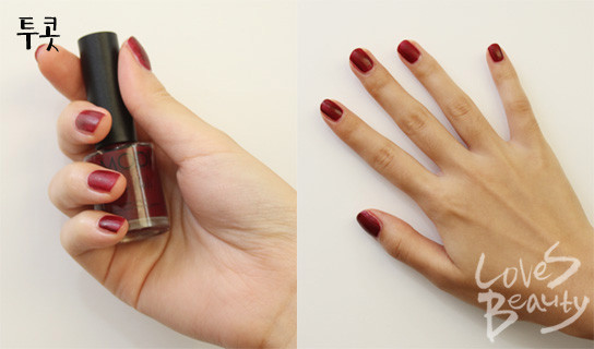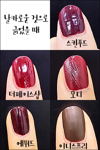 # 테스트 제품스킨푸드 네일비타 알파 ARE02 파이어레드더페이스샵 젤 터치 네일즈 RD 302 미드나잇 버건디아리따움 모디 글렘네일즈 192 시크 버건디에뛰드하우스 플레이 네일 #280 쿵푸고수 레드팬더이니스프리 에코 네일 컬러 PRO 117호 브라운 가죽 자켓# 총평스킨푸드 네일비타 알파 ARE02 파이어레드■ 엄정여 편집장(40대 초반)[발색력] 중 [광택] 중 [지속력] 하 [사용감] 중[총평]버건디 계열 컬러 특성상 착색이 되지 않기 위해 베이스코트를 발라준 다음 사용해야 했다. 버건디 계열의 타사 네일 제품에 비해 제형이 조금 묽어서 발림성은 무난하지만 브러시에 너무 많은 양을 덜지 않도록 주의해야 한다.컬러는 퍼플 컬러에 가까운 버건디로 딱 팥 색깔 같다. 투콧 정도 발라줘야 제대로 컬러가 나왔고 광택이 조금 있다. 브러시가 얇고 길쭉해 잘 발리고 리무버로도 깔끔하게 잘 지워지는 편이다. 단점이라면 건조되기 전에 뭉개진다는 것! 네일 제품 특유의 냄새도 심하다.[만족도] ★★★■ 최은혜 기자(30대 초반)[발색력] 중 [광택] 중 [지속력] 상 [사용감] 중[총평]손톱에 덧바를수록 깊은 와인빛이 도는 컬러. 진하게 바를수록 촌스럽지 않고 매력적인 버건디 컬러가 된다. 기존의 네일비타에서 알파가 더해져서일까? 기존의 제품보다 발색력 면에서 훨씬 낫다는 느낌을 받았다. 하지만 테스트 제품 중 냄새가 가장 심해서 민감한 사람들은 조금 불편해할 것 같다. 전체적으로 무난하게 사용할 수 있는 제품이었다.[만족도] ★★■ 심은혜 기자(20대 후반)[발색력] 중 [광택] 상 [지속력] 중 [사용감] 중[총평]처음 패키지를 봤을 때 진한 포도색상을 생각했는데 투콧을 바르니 포도색상보다 짙은 버건디에 가까웠다. 테스트 제품 중 내 손 피부톤과 가장 어울리는 컬러.원콧만 바르기에는 발색이 잘 되지 않아 최소 투콧을 발라야 했다. 가장 큰 단점은 바르는 내내 냄새 때문에 괴로워서 머리가 아플 정도였다는 것.하지만 점성이 낮아 발림성이 좋았으며 솔 사용감도 무난한 정도. 또한 날카로운 것으로 긁었을 때 크게 스크래치가 나지 않으며 티가 잘 나지 않았다. 마르는 시간도 빠른 편.[만족도] ★★☆■ 최지민 기자(20대 중반)[발색력] 하 [광택] 중 [지속력] 중 [사용감] 중[총평]이름은 [파이어레드]지만 레드보다는 오히려 퍼플에 가까운 짙은 버건디 컬러라 강한 느낌의 컬러를 좋아하지 않는다면 추천하고 싶지 않다. 개인적으로는 손톱이 큰 편이라 좀 더 넓적한 사이즈의 솔을 선호하지만 이 제품 사용감도 나쁘지 않았다. 다만 원콧만 바르면 발색이 제대로 되지 않고 그대로 다닐 수 없을 정도로 손톱이 비춰지는 부분이 많아 투콧 이상을 듬뿍 발라줘야 했다.실내에서는 그냥 강해보이기만 하고 특별하지 않은 컬러라 생각했는데 햇빛에 비춰졌을 때 훨씬 더 분위기 있고 매력적으로 느껴졌다.[만족도] ★★★더페이스샵 젤 터치 네일즈 RD 302 미드나잇 버건디■ 엄정여 편집장(40대 초반)[발색력] 상 [광택] 중 [지속력] 중 [사용감] 중[총평]타 브랜드 버건디 색상들보다 선명한 컬러로 진한 핏빛 색상. 컬러가 선명해 원콧만 발라도 예쁘게 발색된다. 제형도 되직하지 않고 묽어서 바르기 좋다. 지속력은 보통.붓끝이 둥글고 숱이 많고 도톰한 편이라 한 번만 발라도 많은 양의 내용물이 발린다. 굳이 탑코트를 바르지 않아도 될 만큼 광택이 느껴진다.바른 직후와 말랐을 때 색상 차이가 조금 있는데, 마르고 나면 컬러가 더 어두워진다.단점이라면 너무 두껍게 바르면 마르는 동안 공기방울처럼 뽀글뽀글 올라온다는 것. 그래서 한 번 바르고 살짝 말린 다음 한 번 더 발라주는 것이 좋다. 또 네일 제품 특유의 냄새가 심한 편.[만족도] ★★★☆■ 최은혜 기자(30대 초반)[발색력] 상 [광택] 상 [지속력] 중 [사용감] 중[총평]테스트 제품 중 가장 맑은 느낌의 버건디 컬러였다. 컬러를 바르면 손이 밝고 화사해보일 정도.젤네일 콘셉트에 맞게 한번만 발라도 발색이 선명했고 덧바를수록 진한 광택이 느껴져 저렴한 가격으로 젤네일 기분을 낼 수 있는 제품이다. 테스트 제품 중 유일하게 용기에 용량을 표시한 점도 나름 정직한 느낌이 들어 맘에 든다.하지만 생각했던 것 보다 처음의 반짝이는 광택이 오래 유지되지 않아서 조금 실망했다. 또한 테스트한 제품 중 가장 끈적이는 제형이라 용기 입구가 쉽게 지저분해지기도 했다.[만족도] ★★★■ 심은혜 기자(20대 후반)[발색력] 상 [광택] 상 [지속력] 하 [사용감] 하[총평]색상은 가장 예뻤으며 원콧만 발라도 발색이 잘됐다. 다만 내 손 색상과 어울리지 않아 아쉬웠다.바르는 내내 머리가 지끈거릴 정도로 냄새가 독했으며 젤 네일이라 그런지 마르는 시간도 조금 길다.발림성은 좋았으나 솔 자체로는 가장 별로였던 제품. 점성은 아주 약간의 끈적임이 느껴졌으며 날카로운 것으로 긁었을 때 눈에 띄었다.[만족도] ★★■ 최지민 기자(20대 중반)★ BEST 제품[발색력] 상 [광택] 상 [지속력] 중 [사용감] 중[총평]테스트 제품 중 컬러 면에서 가장 마음에 든다. 맑은 버건디 컬러라 손톱 전체에 발라도 쎄보이는 언니(?) 느낌이 덜하고 손이 화사해 보인다. 원콧만 발라도 그 나름의 