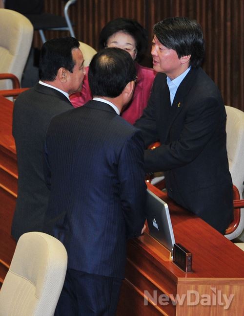 이완구 새누리당 원내대표가 3일 오전 서울 여의도 국회에서 열린 본회의에서 새정치민주연합 안철수 의원과 인사를 나누고 있다.