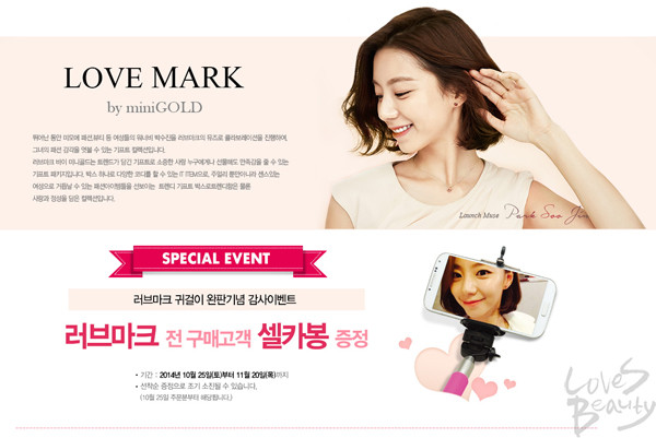 패션 주얼리 브랜드 <미니골드(대표 노민규)>가 [러브마크] 귀걸이 완판을 기념해 [셀카봉 증정 이벤트]를 진행한다.셀카봉은 미니골드는 러브마크 구매 고객 전원에게 증정되며, 미니골드 전국 매장은 물론 홈페이지에서도 진행한다. 기간은 11월 20일까지다.(셀카봉 총 2500개 한정 수량, 소진 시 조기 마감).러브마크는 지난 7월 미니골드가 새롭게 선보인 [2030 여성을 위한 트렌디 기프트 주얼리] 브랜드다.기프트 박스에 메인 주얼리에 어울리는 서브 주얼리를 함께 패키지로 구성해 러브마크 하나만으로 전체 주얼리 스타일링을 완성시킬 수 있는 것이 특징이다.또한 배우 박수진을 러브마크 뮤즈로 발탁, 화보 촬영 시 착용한 러브클레어 귀걸이가 출시 3주 만에 초도 물량이 모두 완판되는 등 큰 인기를 얻고 있다.[사진 = 미니골드]