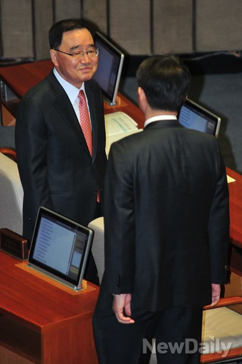 정홍원 국무총리가 3일 오전 서울 여의도 국회에서 열린 본회의에서 류길재 통일부 장관과 대화를 나누고 있다.