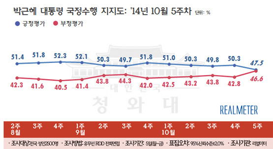여론조사기관 리얼미터 10월5주차 주간조사결과 박 대통령의 국정수행 지지율은 47.5%로 전주 대비 2.8%p 하락했다.