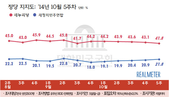 반면 새정치연합은 반사이익을 얻으며 0.9%p 오른 21.8%를 기록했다. 새정치연합은 5주 연속 지지율 상승을 이어가며 3주 연속 20%대를 유지했다. 양당 격차는 20.0%p로 2.2%p 좁혀졌다.