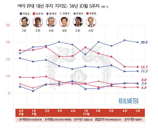 여야 차기 대선주자 지지도에서는 28억 전세 공관 '논란'으로 곤욕을 치른 박원순 시장이 0.6%p 하락한 20.0%를 기록했다.