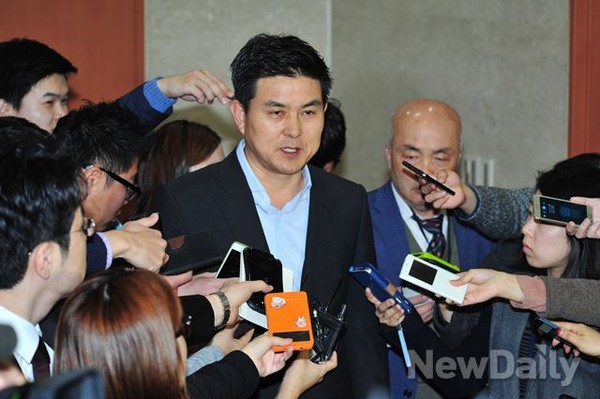 새누리당 김태호 의원이 4일 오전 여의도 국회의사당 정론관에서 자신의 최고위원직 사퇴 철회 기자회견을 가진 후 기자들과 질의응답 시간을 가지고 있다.