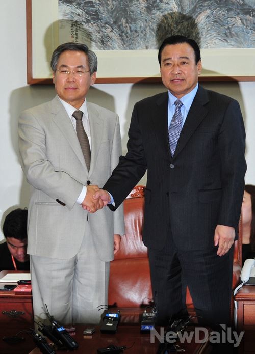 이완구 새누리당 원내대표와 우윤근 새정치민주연합 원내대표가 4일 오전 여의도 국회 운영위원장실에서 열린 양당 원내대표 주례회동에서 악수를 나누고 있다.