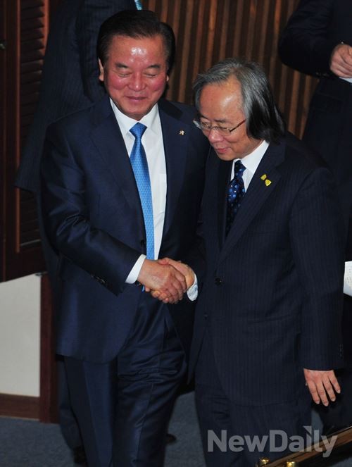 정갑윤 국회 부의장이 4일 오전 여의도 국회의사당에서 경제분야 대정부 질문을 위해 열린 본회의에 출석해 이주영 해양수산부 장관과 인사를 나누고 있다.
