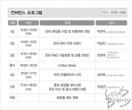 올해 컨퍼런스를 위해 준비한 5개 키워드는 ▲유통 ▲마케팅 트렌드 ▲상품 트렌드 ▲소비자 트렌드 ▲글로벌이다.해외시장에 대한 관심이 높아 올해 [글로벌]을 새롭게 추가했다. 화장품 정책, 제도와 관련한 내용도 컨퍼런스 당일 배포되는 교재에 별도로 게재한다.분야별 전문가들을 통해 보다 실질적이면서도 풍부한 기술과 경험을 전수받을 수 있는 뜻 깊은 자리가 될 것으로 확신한다.올해 컨퍼런스는 한국화장품공업협동조합 공동주최, 코스메카코리아 후원으로 진행된다.[사진 = CMN]