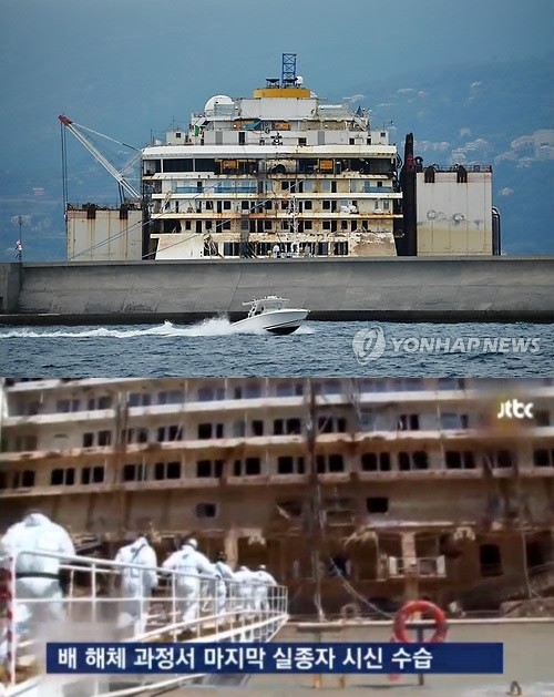 '이탈리아판 세월호'로 불리는 이탈리아 유람선 콩코르디아호에서 마지막 실종자의 시신이 발견됐다. 사고가 난 지 2년 10개월 만이다.이탈리아 일간 레푸블리카가 3일(현지시간) "이탈리아 제노바에서 선체 해체작업에 들어간 이탈리아 초대형 유람선 코스타 콩고르디아호에서 마지막 실종자의 시신을 찾았다"고 보도했다.마지막 시신은 인도 출신 웨이터 러셀 레벨로로, 8번 갑판의 한 선실에서 발견된 것으로 전해졌다. 이탈리아 당국은 레벨로의 시신을 산 마르티노에 있는 과학수사연구소에 보내 정확한 감식을 할 예정이다.콩코르디아호는 지난 2012년 1월 13일, 70개국의 승객과 선원 등 4천229명을 태우고 항해하다 이탈리아 질리오섬 해안 암초에 부딪혀 침몰했으며, 당시 32명이 사망했다.특히, 이 사건은 항해 중에 침몰했다는 부분과 선장이 승객들을 뒤로 한 채 가장 먼저 유람선을 빠져나가 '이탈리아판 세월호'로 불려왔다.[콩코르디아호 마지막 실종자 발견, 사진=연합뉴스/ JTBC 뉴스 캡처]
