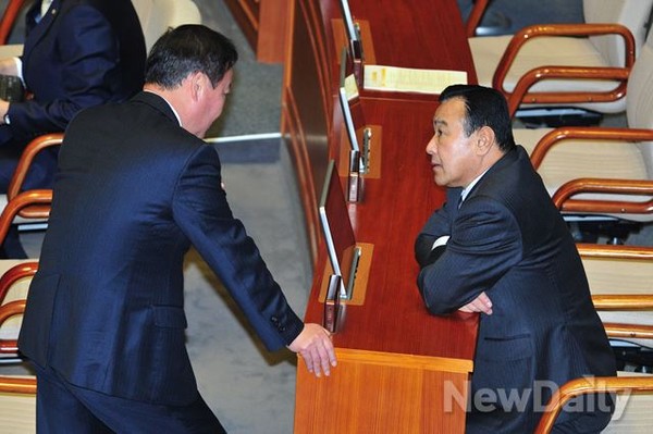 이완구 새누리당 원내대표가 5일 오전 여의도 국회의사당에서 열린 교육사회문화 대정부 질문에 참석해 김재원 의원과 대화를 나누고 있다.