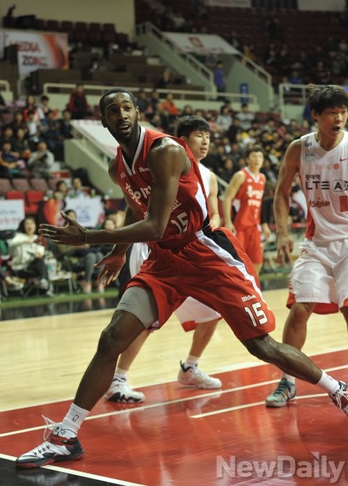 7일 오후 안양시 안양실내체육관에서 열린 2014-2015 KCC 프로농구 안양KGC 와 서울 SK의 경기에서 안양KGC 레슬리 선수가 골밑 돌파 후 파울을 얻어내고 있다.