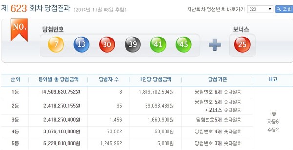 2014년 11월 8일 실시된 제623회 나눔로또 1등 당첨번호는 '7, 13, 30, 39, 41, 45'이며, 2등 보너스 번호는 25번이다.이번 로또 623회차 추첨 결과 1등 당첨자는 8명으로 18억1370만2594원의 당첨금을 받게 됐다.1등 번호 중개와 보너스 번호를 맞힌 2등은 35명이며, 1인당 6909만3433원씩 지급받는다. 당첨번호 중 5개를 맞힌 3등은 1456명으로 당첨금은 각 166만900원이다.5만원의 당첨금을 받는 4개의 번호를 맞힌 4등은 7만3522명이며, 5000원의 고정 당첨금을 받는 5등은 124만5962명이 나온 것으로 집계됐다.한편, 이번주 로또623 총 판매금액은 585억414만2000원이다.[로또623회당첨번호, 사진=로또 홈페이지 캡처]