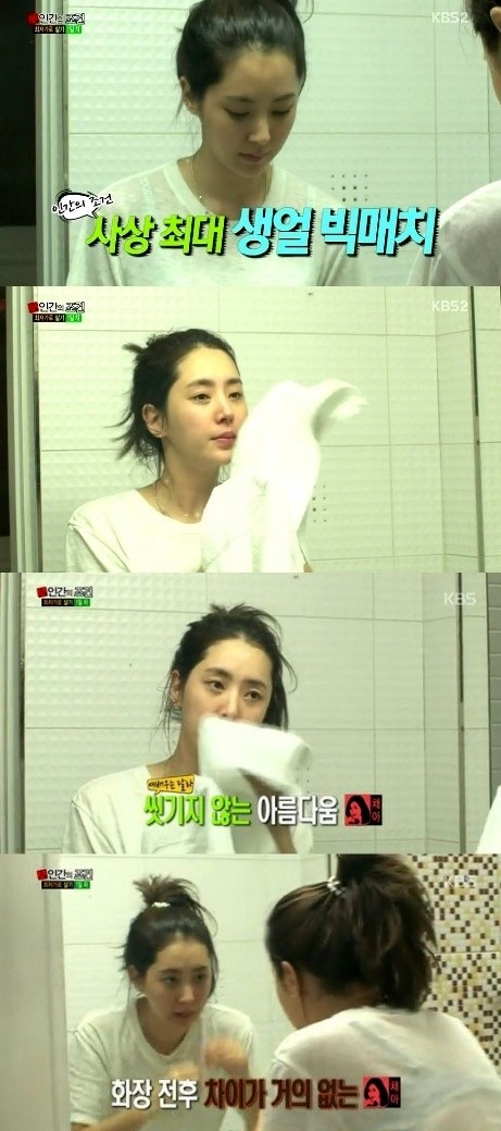 배우 한채아가 우월한 민낯을 드러냈다.지난 8일 방송된 KBS 2TV '인간의 조건'에서는 '최저가로 살기' 미션을 수행하는 김신영, 김영희, 김지민, 신보라, 한채아, 애프터스쿨 리지 등의 모습이 그려졌다.이날 '인간의 조건' 새 멤버로 합류한 한채아는 취침하기 전 세안하는 모습이 그대로 공개됐다. 클렌징 티슈로 메이크업을 지운 한채아는 세수를 하기 시작했고, 말끔하게 씻어낸 그녀는 뽀송뽀송한 투명 피부를 자랑했다.특히, 한채아는 화장 전후 차이가 거의 없을 만큼 완벽한 민낯을 선보여 멤버들의 부러움 섞인 질투를 한 몸에 받았다.['인간의 조건' 한채아 민낯, 사진=KBS2 '인간의 조건' 방송 캡처]