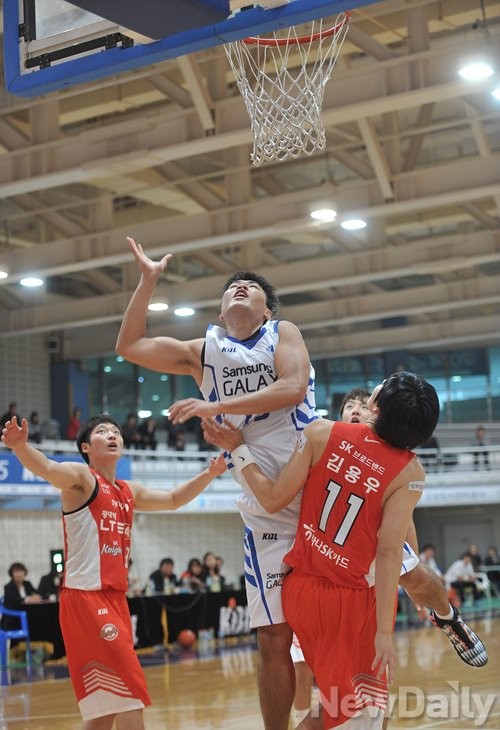 [프로농구연맹 (KBL D리그)] 10일 오후 고양시 고양 실내 보조체육관에서 열린 2014-2015 KBL D리그 프로농구 서울 삼성 과 서울 SK의 경기에서 서울 삼성 방경수 선수가 파울을 얻어내고 있다.