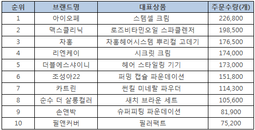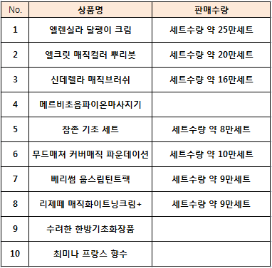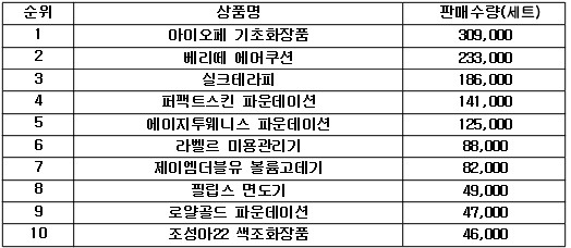 <CJ오쇼핑>, <GS샵>, <현대홈쇼핑>, <롯데홈쇼핑>, <NS홈쇼핑>, <홈앤쇼핑> 6개사의 2014년 3분기 실적 가운데 뷰티상품군은 어떤 변화가 있었을까?전체적으로 다양한 뷰 기기와 에어쿠션이 상반기에 이어 여전히 강세를 보였으며 쌀쌀해지는 날씨를 대비한 보습력 있는 스킨케어 제품의 약진도 눈에 띄었다.업계 관계자는 “제품력은 물론 홈쇼핑 채널특성을 고려한 콘셉트를 갖추면서 시연 영상을 흥미롭게 구현할 수 있는 제품이 인기가 높다”며 “스테디셀러와 더불어 콜라보레이션 등을 통해 단독으로 선보이는 제품 역시 매출 호조를 띄는 편”이라고 전했다.[CJ오쇼핑 TV홈쇼핑 뷰티 부문 2014년 3분기 히트상품(기간 2014 1/1~9/30 판매수량 기준)]CJ오쇼핑은 다양한 구성으로 선보인 <아이오페 스템셀 크림>이 22만 6000여 세트로 가장 많은 판매수량을 기록했고 <맥스클리닉 로즈비타민오일 스파클렌저>가 2위를 차지했다.맥스클리닉의 오일 스파클렌저는 뛰어난 보습효과를 가진 신개념 오일폼으로 [반전오일]이라고 불리며 온오프라인에서 인기를 끌고 있는 제품이다.고현정의 [빛 크림]으로 유명세를 탄 <리엔케이 시크릿 크림> 역시 보습 및 항산화 효능으로 환절기가 가까워오면서 판매량이 급격히 늘어나 4위에 이름을 올렸다.또한 <차홍>의 뿌리컬 고데기를 비롯해 <더블에스샤이니>의 스타일링 기기까지 지난 상반기 전체 히트상품 순위 10위권에 들었던 뷰티기기들이 3분기 뷰티상품 순위 내에서 각각 3위와 5위를 기록했다.[GS샵 TV홈쇼핑 뷰티 부문 2014년 3분기 히트상품(기간 2014 1/1~9/30 판매수량 기준)]GS샵은 <아모레퍼시픽>을 비롯한 <LG생활건강>, <애경> 등 대기업이 선보이고 있는 화장품 및 미용 제품이 상위권을 차지했다.<아이오페>의 기초화장품이 30만 9000세트로 월등히 높은 판매수량을 기록했으며 <베리떼>의 에어쿠션은 기존 제품에 비해 개선된 커버력으로 입소문을 타 상반기 판매량보다 8만 세트 가까이 증가한 수량으로 2위를 차지했다.아모레퍼시픽 계열의 브랜드가 1, 2위에 각각 이름을 올린 가운데 LG생활건강의 <실크테라피>가 18만 6000세트로 뒤를 이었고 애경의 기능성메이크업 <에이지투웨니스> 파운데이션이 12만 5000세트로 4위에 올랐다.더불어 <제이엠더블유>의 볼륨고데기, 홈 에스테틱 기기 <라벨르> 등 뷰티 디바이스가 6위와 7위에 자리했다.[현대홈쇼핑 TV홈쇼핑 뷰티 부문 2014년 3분기 히트상품(기간 2014 1/1~9/30 판매수량 기준)]현대홈쇼핑의 경우 중년 여성들의 가는 모발과 주저앉은 머리를 보완해 주기 위해 개발된 보다 합리적인 가격의 미용기기들이 상위권에 올랐다.지난 상반기 전체 분야 히트상품 3위를 기록했던 <로페 볼륨매직 뽕고데기>가 40대 이상 주부들에게 큰 인기를 얻으며 30만개가 넘는 판매수량으로 뷰티 히트상품 1위에 올랐고 <오제끄 구르뽕>이 뒤를 이었다.현대홈쇼핑이 지난 6월 신설한 뷰티프로그램 [뷰티톡]을 통해 방송되기도 했던 <아이오페 에어쿠션 RX>, <이튠 지그재그 무빙 마스카라> 등은 높은 판매량을 기록하며 10위권에 이름을 올렸다.아이오페는 스테디셀러 에어쿠션 XP와 홈쇼핑 전용으로 출시한 에어쿠션 RX가 모두 10대 히트상품 순위에 들어 눈길을 끌었다.<셀더마 마스크팩 7>, <AHC 아이크림>, <메디엘 퍼밍 마스크 세럼> 등 다양한 스킨케어 제품도 순위에 올랐는데 특히 AHC 아이크림은 2분기부터 선보이기 시작한 제품임에도 무서운 상승세로 5위를 차지해 이목을 끌었다.아이오페는 롯데홈쇼핑에서도 가장 많이 팔린 화장품이었다.에어쿠션 RX는 압도적인 판매량으로 1위를 차지했으며 기초 스킨케어 라인 역시 상반기에 이어 베스트 아이템 순위에 올랐다.헤어디자이너 태양의 <허니블룸바이태양 트리트먼트>는 아이오페 에어쿠션의 뒤를 이어 3분기 가장 많은 판매량을 기록했으며 <한율 광채쿠션>, <바디판타지 퍼퓸 미스트> 등 새롭게 순위권에 이름을 올린 제품들도 있었다.[NS홈쇼핑 TV홈쇼핑 뷰티 부문 2014년 3분기 히트상품(기간 2014 1/1~9/30 판매수량 기준)]NS홈쇼핑은 달팽이 점액 성분을 80% 함유한 고영양 크림 <엘렌실라 달팽이 크림>이 1위를 차지했다.이 제품은 2회 이상 재구매가 15만 건에 달하는 등 높은 인기를 누리며 4년 연속 이·미용 분야 히트상품 1위를 고수하고 있다.또한 새치커버 브러시 <엘크릿 매직컬러 뿌리봇>, 속눈썹 연장 브러시 <신데렐라 매직브러시>, <메르비 초음파 이온마사지기> 등 셀프 뷰티기기들이 나란히 순위권에 올랐다.특히 홈 에스테틱기기 메르비는 2013년~2014년 상반기까지 이·미용기기 분야 판매 1위를 기록했으며 재구매가 6000건을 돌파한 히트상품이다.최근 온오프라인에서 화제가 되고 있는 입술 문신팩 <베리썸 웁스 립틴트팩>과 기존 제품에서 업그레이드된 <리제떼 매직 화이트닝 크림+> 등 쉽고 자연스러운 메이크업을 돕는 제품들이 7위와 8위에 자리했다.10위는 향수 전문가 최미나의 프랑스 직수입 향수가 차지했으며 NS홈쇼핑은 향수 4종을 방송마다 다른 기획으로 선보이고 있다.상반기에 뷰티 카테고리보다 생활용품, 건강식품의 활약이 두드러졌던 홈앤쇼핑은 3분기 인기상품 순위 역시 주방 생활용품과 다양