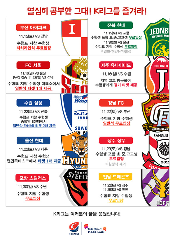 전북 현대 모터스는 오는 15일 전주월드컵경기장으로 수험생을 초대한다. 또 올 시즌 마지막 경기가 열릴 30일에도 수험표만 지참하면 일반석(E, N석) 티켓을 제공한다. 제주 유나이티드는 수험생들을 직접 찾아간다. 제주 구단은 지역 고등학교를 찾아가 수능 수험생들에게 16일 열릴 수원 삼성 블루윙즈와의 홈경기 티켓을 전달할 계획이다.