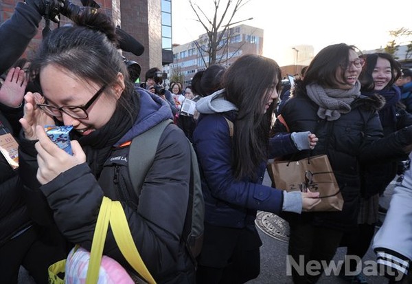 2015학년도 대학수학능력시험 날인 13일 오전 서울 안국동 풍문여고에 마련된 고사장 앞은 응원나온 후배들의 격려를 받은 수험생들이 밝게 웃으며 입실하고 있다.
