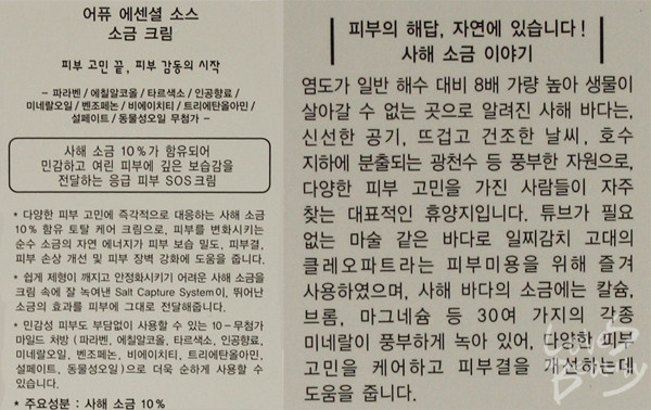 # 어퓨 에센셜 소스 솔트 크림사해 소금 10%가 함유돼 민감하고 여린 피부에 깊은 보습감을 전달하는 응급 피부 SOS 브랜드숍 최초 솔트 크림.피부를 변화시키는 순수 소금의 자연 에너지가 피부 보습 밀도, 피부결, 피부 손상 개선 및 피부 장벽 강화에 도움을 준다.10 무첨가 마일드 처방으로 더욱 순하게 사용 가능하며 100% 천연유래 계면활성제로만 이뤄져 있어 민감성 피부도 부담없이 사용할 수 있다.사해소금 - 염도가 일반 해수 대비 8배 가량 높아 생물이 살아갈 수 없는 곳으로 알려진 사해 바다는 신선한 공기, 뜨겁고 건조한 날씨, 호수 지하에 분출되는 광천수 등 풍부한 자원으로 다양한 피부고민을 가진 사람들이 자주 찾는 대표적 휴양지이다.고대 클레오파트라는 피부미용을 위해 즐겨 찾았으며 사해 바다의 소금에는 칼슘, 브롬, 마그네슘 등 30여 가지의 각종 미네랄이 풍부하게 녹아 있어 피부케어에 도움을 준다.# 전성분정제수, 씨솔트, 글리세린, 하이드로제네이티드코코넛오일, 이소헥사데칸세테아릴알코올, 파라핀, 스테아릭애씨드, 사이클로펜타실록산, 글리세릴스테아레이트사이클로헥사실록산, 디메치콘, 스피룰리나추출물, 세테아릴글루코사이드피이지-100스테아레이트, 폴리소르베이트20, 알란토인디메치콘올, 폴리아크릴레이트-13, 폴리이소부텐, 디포타슘글리시리제이트판테놀, 토코페릴아세테이트, 잔탄검, 자몽껍질오일, 만다린껍질오일, 부틸렌글라이콜소듐하이알루로네이트, 일랑일랑꽃오일, 산수유추출물, 로즈마리잎오일, 황칠나무추출물구기자추출물, 쑥추출물, 당잔대뿌리추출물, 고본추출물, 국화꽃추출물, 귤껍질추출물의이인추출물, 참마뿌리추출물, 콩싹추출물, 어성초추출물지골피추출물, 쌀추출물, 모란뿌리추출물, 황금추출물, 가자추출물1,2-헥산디올, 카프릴릴글라이콜, 트로폴론, 트로메타민, 페녹시에탄올, 클로페네신