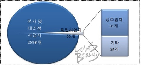 ▲사업자별 후원방문판매업자 수공정위에 따르면 국내 후원방문판매 사업자는 17개 주요 사업자와 소속 대리점이 2598개에 달한다. 공정위가 분류한 17개 주요 사업자는 아모레퍼시픽, LG생활건강, 유니베라, 풀무원건강생활, 타파웨어브랜즈코리아, 코리아나화장품, 마임, 김정문알로에, 한국화장품, KGC라이프앤진, 이롬, 코웨이, 이에스그룹, 알즈너, 녹십초, 뉴랜드알로에, 이든네이처 등이다.별도 본사가 없는 독립 사업자는 55개로 전체 후원방문판매업자를 합산하면 총 2653개다. 후원방문판매 시장의 전체 매출액은 2조 321억 원으로 총 판매원 수는 32만 명이었다.판매업자 1개당 연간 평균 매출액은 7억7000만원, 업체별 평균 판매원 수는 121명으로 대다수의 후원방문 판매업자가 소규모 사업자인 것으로 집계됐다. 주요 취급 품목은 화장품, 건강기능식품, 생활용품, 상조상품으로 나타났다.