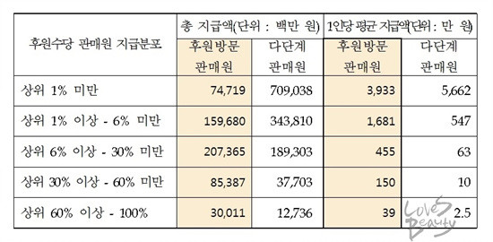 ▲2013년 후원수당 지급분포 현황 비교반면 후원수당에서는 큰 차이가 벌어졌다. 후원방문 판매업자가 소속 판매원에 지급한 후원수당 지급 총액을 보면 총 5029억 원으로, 본사와 대리점 사업자 후원수당은 3892억 원(77.5%)에 달했다.후원수당 지급총액이 가장 많은 연간 사업자는 아모레퍼시픽과 소속 대리점 사업자들로서 연간 1828억 원을 지급한 것으로 조사됐다.판매원 1인당 평균 지급액이 가장 많은 사업자는 풀무원건강생활 대리점 사업자들로서 연간 평균 752만 원을 지급한 것으로 나타났다.독립 사업자의 후원수당 지급총액은 1137억 원(22.5%)에 그쳐 판매원 1인당 평균 지급액은 203만 원이었다.후원수당을 받은 판매원 중 상위 1% 미만인 판매원(1900여 명)의 연간 1인당 평균 지급액은 3933만 원이었으나 나머지 판매원(18만 8000명)의 연간 1인당 평균 지급액은 256만 원에 불과해 기본 생활조차 어려운 형편인 것으로 나타났다.상위 1% 미만 판매원이 1년간 지급받은 후원수당 747억 원은 총 지급액(5029억 원)의 15% 수준으로 다단계 판매 시장의 54.7%에 비해 편중현상은 낮은 편이었다.