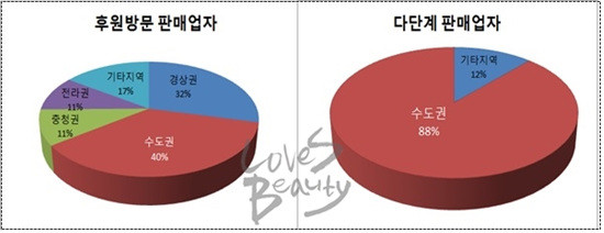 ▲후원방문 판매업자와 다단계 판매업자 지역별 분포 비교각 사업자들이 주로 취급하는 품목은 화장품, 건강기능식품, 생활용품, 의료기기로 다단계 판매 사업자와 유사했으며, 후원방문 판매업자는 수도권에 약 40% 정도로 가장 많이 분포했다.수도권의 뒤를 이어 경상권 약 32%, 충청권, 전라권이 각각 11%, 기타 지역이 17%를 차지했다.정창욱 공정위 소비자정책국 특수거래과장은 “매출액, 후원수당, 매출품목 등 후원방문 판매업자의 자세한 정보를 제공해 소비자와 후원방문 판매원 희망자의 합리적인 의사결정에 도움이 될 것”이라며 “공개된 자료를 토대로 건전한 시장질서 정착을 위해 법 위반 행위를 지속적으로 감시할 계획”이라고 밝혔다.[사진 = 공정거래위원회]