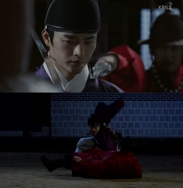 '왕의 얼굴' 서인국이 고난도 액션연기로 눈길을 사로잡았다.지난 19일 첫 방송된 KBS 2TV 새 수목드라마 '왕의 얼굴'(극본 이향희 윤수정, 연출 윤성식 차영훈)에서는 서고에서 관상 책을 보다 잠든 광해군(서인국)이 용안비서를 훔치기 위해 숨어든 괴한과 마주하는 장면이 그려졌다.이날 서인국은 괴한의 위협에도 맞서 싸우며 화려한 액션신을 선보였다. 특히, 무예에도 능한 광해군을 연기하기 위해 서인국은 실제로 드라마 액션신 대부분을 대역 없이 소화했다. 서인국은 이를 위해 쉬는 시간 틈틈이 무술감독에게 끊임없는 지도를 받으며 역할에 임하고 있다는 스태프들의 전언이다.또한, 서인국은 첫 사극 연기임에도 불구하고 극중 가희(조윤희)와의 능청스러운 연기부터 아버지 선조(이성재)를 대할 때의 섬세한 감정 표현과 안정적인 대사, 여기에 화려한 액션까지 완벽하게 선보이며 캐릭터에 대한 몰입도를 높였다.한편, '왕의 얼굴'은 서자출신으로 세자 자리에 올라 피비린내 나는 정쟁의 틈바구니에서 끝내 왕으로 우뚝 서게 되는 광해의 파란만장한 성장스토리와 한 여인을 두고 삼각관계에 놓이게 되는 아버지 선조와 아들 광해의 비극적 사랑을 그린이다. '왕의 얼굴' 2회는 20일 밤 10시 방송된다.[첫방 '왕의 얼굴' 서인국, 사진=KBS2 '왕의 얼굴' 방송 캡처]