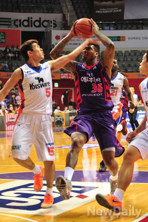 20일 고양실내체육관에서 열린 '2014-2015 KCC프로농구' 고양 오리온스와 인천 전자랜드의 경기에서 전자대랜드 정병국 선수가 공 대신 오리온스 가르시아 선수 머리를 터치하고 있다.