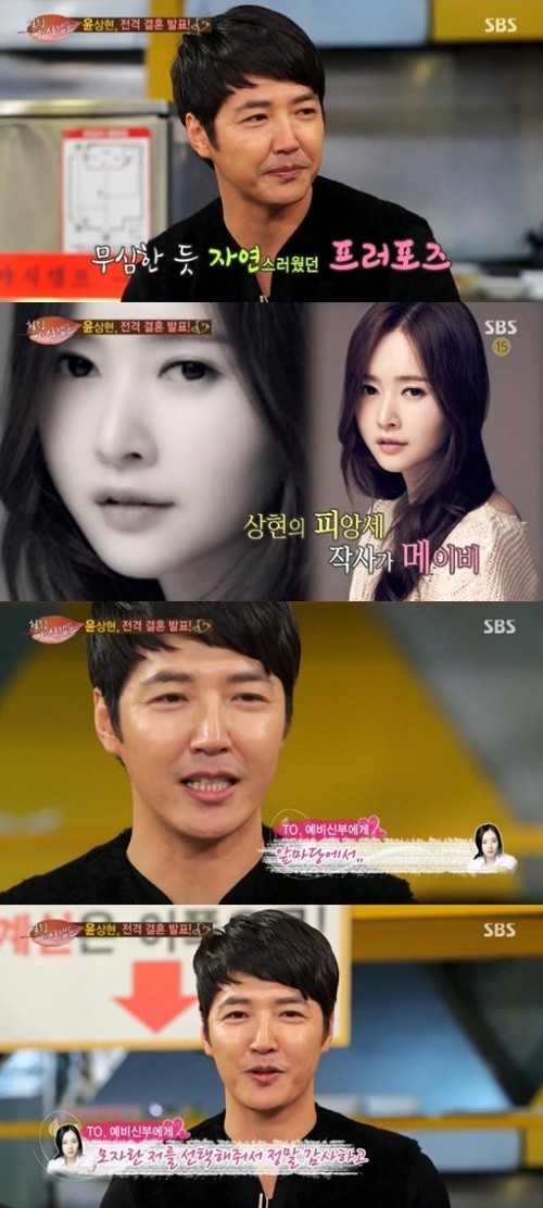 배우 윤상현이 피앙새 메이비에게 애정 가득한 영상편지를 보냈다.지난 24일 방송된 SBS '힐링캠프'는 연예계 대표 독거남 김광규, 윤상현, 주상욱과 이들의 멘토를 자청한 배우 소유진의 남편 백종원 대표가 함께 하는 특집 '힐링 야식캠프'로 꾸며졌다.이날 윤상현은 에비신부 메이비에 대해 "소개팅으로 처음 만났다. 6세 차이 나고 내 일을 잘 이해해준다. 긍정적이고 밝은 사람이다"고 밝혔다.이후 윤상현은 카메라를 바라보며 "앞으로 같이 강아지도 키우고 아이도 낳고 RC 헬기도 같이 날리며 행복하게 살자. 모자란 나를 선택해줘서 정말 고맙다"라고 영상편지를 띄웠다.한편, 윤상현과 메이비는 지난 4월 지인의 소개로 만나 7월께 연인 사이로발전했으며, 내년 2월 8일 결혼식을 올린다. 결혼식 장소는 미정이다.['힐링캠프' 윤상현 메이비 결혼 스토리, 사진=SBS '힐링캠프' 캡처]
