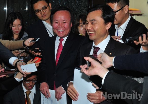 25일 오전 여의도 국회 새누리당 원내수석부대표실 앞에서 새누리당 김재원 원내수석부대표와 새정치민주연합 안규백 원내수석부대표가 누리과정 예산안 초안을 합의 후 브리핑을 하고 있다.
