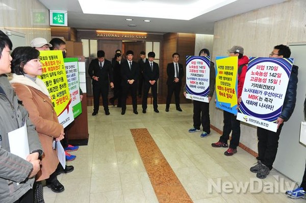 이날 장영보 대표이사는 노조원들을 피해 화물용 엘리베이터를 이용해 자리를 떠났다.