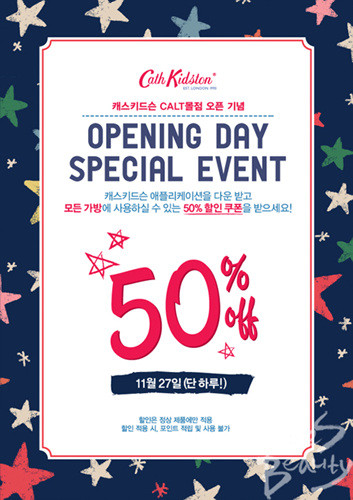 런던 라이프 스타일 브랜드 <캐스 키드슨(Cath Kidston)>은 삼성동 도심공항터미널 CALT몰점 오픈을 기념해 27일 단 하루 동안 전 매장에서 모든 가방을 50% 할인가에 판매한다.단 키즈 제품은 제외되며, 캐스 키드슨 어플리케이션 다운로드 후 발급된 [가방 50% OFF] 쿠폰 제시 시 적용 가능하다.한편 캐스 키드슨은 도심공항터미널 CALT존 지하 1층에 새로운 매장을 오픈했다.캐스 키드슨의 CALT몰점은 유동 인구가 많은 해당 상권의 특성을 감안해 보다 넓은 규모의 매장을 자랑하며, 매장 규모에 걸맞게 다양한 제품군을 판매한다.[사진 = 캐스 키드슨]