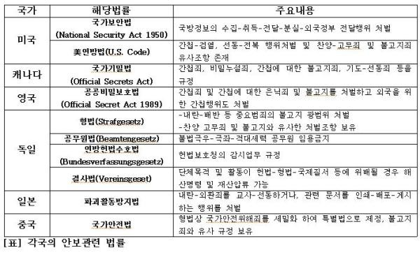 더군다나 핵무기를 보유한 북한과 대치하고 있는 안보상황에서 안보관련 핵심법률을 폐지하라고 하는 것은 무장해제를 요구하는 것과 같다. 주요 국가들의 안보관련 법을 살펴보면 아래와 같다.