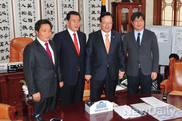 정의화 국회의장이 27일 오전 여의도 국회 의장실에서 홍문표 예결위원장을 비롯해 예결위 여야 간사인 새누리당 이학재 의원, 새정치민주연합 이춘석 의원과 만나 내년도 예산안 기한 내 처리를 당부하고 있다.