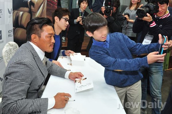 격투기 선수 추성훈 이 28일 오전 서울 강남구 역삼동 카페드 바디프랜드에서 열린 오픈 기념 팬 사인회에서 팬과 함께 사진을 찍고 있다.