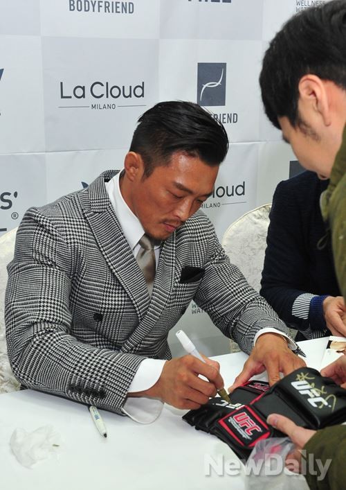 격투기 선수 추성훈 이 28일 오전 서울 강남구 역삼동 카페드 바디프랜드에서 열린 오픈 기념 팬 사인회에서 팬에게 사인을 해주고 있다.