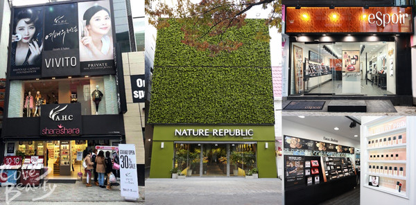 우리나라에서 판매되고 있는 다양한 화장품 브랜드를 만나보려면 [명동]으로 가면 된다.유동인구가 하루에 150만 명에 달하는 명동은 해외 관광객들의 필수 코스로도 자리잡으며 상징적인 의미를 지니고 있다.특히 해마다 높은 증가세를 보이고 있는 요우커를 사로잡으려는 브랜드들의 전략이 돋보이는 곳으로 일반 지역에서는 만나볼 수 없는 개성있는 매장들을 쉽게 만나볼 수 있다.최근에 오픈한 카버코리아, 에스쁘아, 네이처리퍼블릭도 각각 브랜드 콘셉트와 철학을 담은 독특한 매장 형태로 내국인들은 물론 해외 관광객을 공략하기 위한 전략을 선보이고 있다.