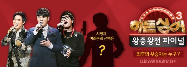 JTBC '히든싱어3' 왕중왕전 파이널 생방송을 앞두고 와일드카드로 살아날 모창 능력자는 누가 될 것인지에 대해 네티즌들의 관심이 증폭된다.'와일드카드'는 마지막 한 장의 결승 티켓을 시청자들의 선택으로 돌리는 제도로, 그 어느 때보다 치열한 경쟁으로 아쉽게 탈락한 모창 능력자들 중 단 한 명만이 파이널 생방송에 합류 할 수 있다.와일드카드 투표는 지난 2주에 걸친 왕중왕전 방송 직후부터 24시간 동안 '히든싱어' 홈페이지와 소리바다 앱을 통해 진행됐다.제작진에 의하면 "24시간 동안 무려 10만 건에 육박하는 투표율을 보이며, 접속자가 폭주해 한차례 서버가 다운되는 등 예상을 뛰어넘는 시청자들의 성원에 깜짝 놀랐다"며 "시청자들의 관심에 감사드리며, 여러분의 선택으로 합류 할 와일드카드는 생방송 당일 공개 될 예정이다"고 전했다.한편, 왕중왕전 파이널 생방송에는 '수영강사 박현빈' 김재현, '나이트클럽 환희' 박민규, '발전소 이승환' 김영관이 확정지은 가운데, 와일드카드 제도로 TOP4에 안착하게 될 모창 능력자는 과연 누구일지, 그 주인공은 29일 밤 11시 JTBC '히든싱어3'를 통해 공개된다.['히든싱어3' 왕중왕전, 사진=JTBC]