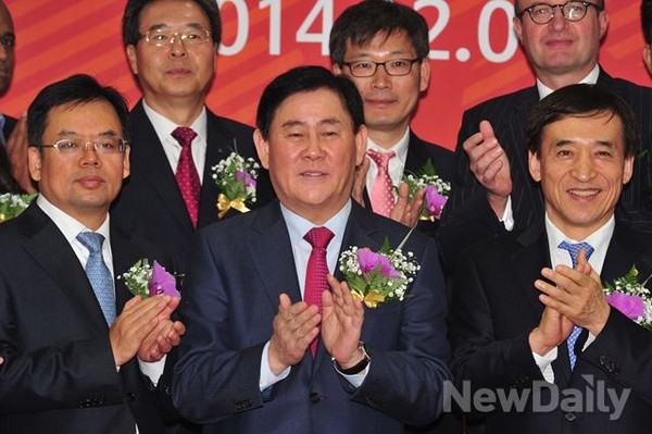 최경환 부총리와 이주열 총재가 참석자들과 1일 오전 서울 중구 외환은행 본점에서 원-위안화 은행간 직거래시장 개장개장을 축하하며 박수를 치고 있다.