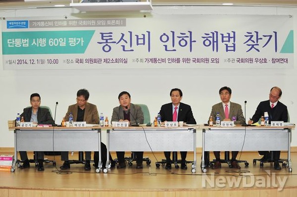 1일 오전 서울 여의도 국회 의원회관에서 열린 새정치민주연합 우상호 의원실과 참여연대 주관 [단통법 시행 60일 평가 통신비 인하 해법 찾기] 토론회에서 참석자들이 토론을 벌이고 있다.