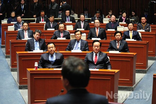 이완구새누리당 원내대표와 의원들이 2일 오전 서울 여의도 국회 예결위회의장에서 열린 의원총회에서 예산결산특별위원회 간사인 이학재 의원의 발언을 듣고 있다.
