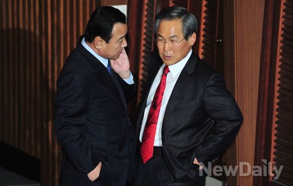이완구 새누리당 원내대표가 2일 오후 서울 여의도 국회 본회의장에서 우윤근 새정치민주연합 원내대표와 대화를 나누고 있다.