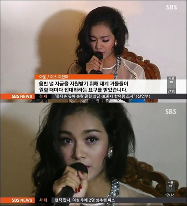 지난 5월 서울에서 열린 국제미인대회에서 우승한 '미스 미얀마' 메이 타 테 아웅(16)이 성접대를 강요받은 것이 사실로 확인돼 충격을 주고 있다.3일 국제미인대회 '미스 아시아퍼시픽월드' 조직위는 "아웅과 N매니저먼트 계약사 대표 최모(48)씨 등을 통해 미스 미얀마에게 성접대를 강요받은 사실을 밝혀냈다"고 전했다.조직위에 따르면 지난 5월 미인대회에서 우승한 미스 미얀마 아웅은 N매니저먼트사로부터 음반제작과 보컬 트레이닝 등을 제안받고 계약을 체결을 하기 위해 8월 재입국했다.하지만 N매니저먼트사 대표 최씨는 귀국 첫날부터 서울의 모 호텔에서 "돈이 없으니 고위층 인사에게 접대를 해야 한다"며 성접대를 강요한 것. 이 같은 사실은 최근 사법적 대응에 나선 조직위 관계자에게 최씨가 실토하면서 드러났다.앞서 지난 5월 미스 미얀마는 시가 2억 원 상당의 왕관을 들고 잠적한 뒤 8월 미얀마 양곤에서 기자회견을 열고 "우승한 뒤 머리부터 발끝까지 성형수술을 하라는 압박을 받았다"고 주장했다.또한, 우승 후 한국에서 가수가 되려고 했던 아웅은 "음반을 낼 자금을 모으기 위해 재계 거물들이 원할 때마다 접대에 나서라는 지시를 받기도 했다"고 밝혀 파문이 일었다.[미스 미얀마 아웅, 사진=SBS 영상 캡처]