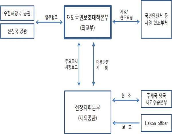한편, 안전처는 이날 오후 4시쯤 <해외 재난시 위기관리업무 수행체계>에 대한 보도 참고자료를 통해 '해외재난시 위기관리업무 수행체계'에 대해 다음과 같이 설명했다.