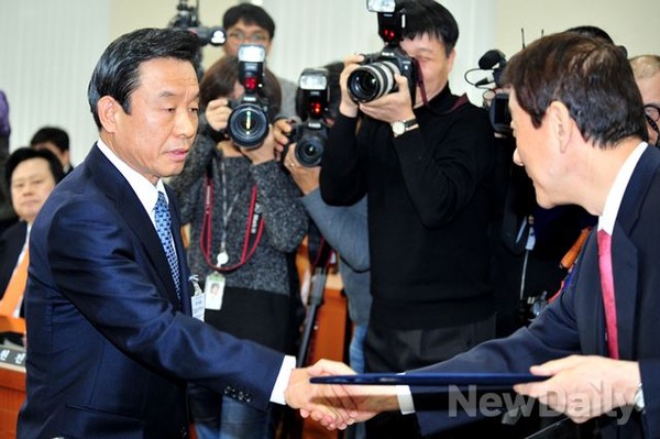 박인용 국민안전처 장관 부호자가 4일 오전 서울 여의도 국회의사당 안전행정위원회에서 열린 인사청문회에서 증인선서문을 진영 위원장에게 전달하고 있다.