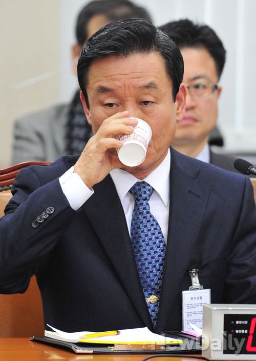 박인용 국민안전처 장관 부호자가 4일 오전 서울 여의도 국회의사당 안전행정위원회에서 열린 인사청문회에서 물을 마시고 있다.