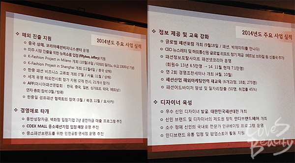창립 30주년을 맞이하는 2015년의 향방에 대해서는 "[글로벌], [컬처&라이프스타일], [디지털]이라는 세 가지 방향성 아래 기존의 정부 및 민간사업을 정비할 예정"이라며 "미래의 변화된 산업 환경 아래 한국 패션산업의 경쟁력 강화를 위해 한걸음 더 도약하겠다"고 전했다. -