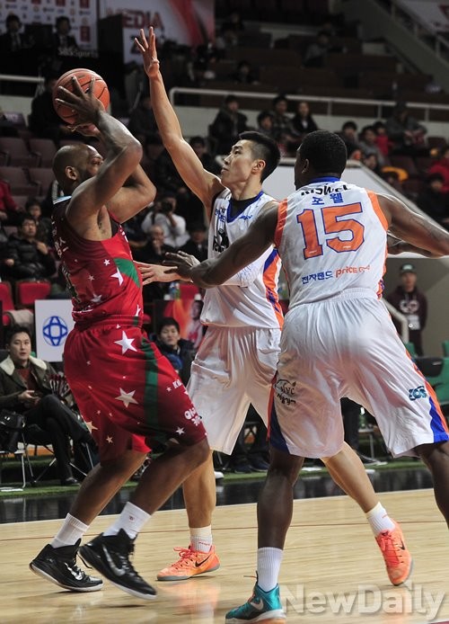 6일 오후 안양시 안양실내체육관에서 열린 2014-2015 KCC 프로농구 안양KGC 와 인천 전자랜드의 경기에서 인천 전자랜드 수비가 안양 KGC 월리암스 선수를 집중 마크 하고 있다.